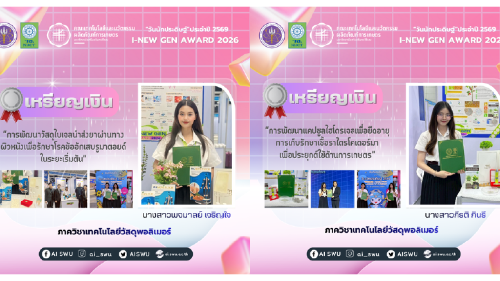 ขอแสดงความยินดีกับนิสิตชั้นปีที่ 4 ภาควิชาเทคโนโลยีวัสดุพอลิเมอร์ ที่ได้รับรางวัลเหรียญเงิน 🥈 จากการประกวด Thailand New Gen Inventors Award (I–New Gen Award 2026) เมื่อวันที่ 9 มกราคม 2569 จัดโดย สำนักงานการวิจัยแห่งชาติ (วช.)