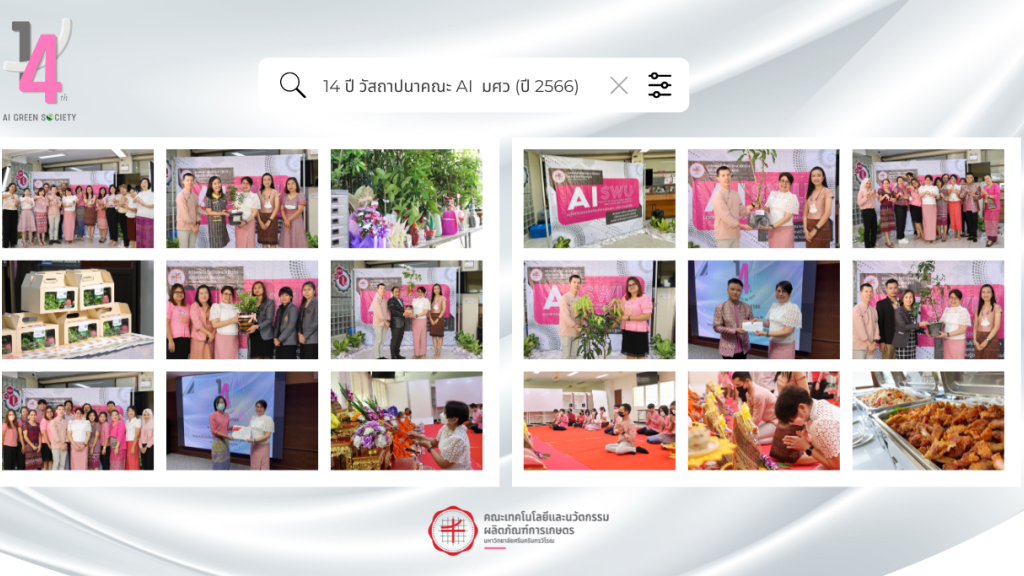 ข่าว 2023-05-02 14 ปี วันสถาปนาคณะเทคโนโลยีและนวัตกรรมผลิตภัณฑ์การเกษตร (AI GREEN SOCIETY ) สู่การพัฒนาอย่างยั่งยืน . เมื่อ วันที่ 1 พฤษภาคม 2566 ณ คณะเทคโนโลยีและนวัตกรรมผลิตภัณฑ์การเกษตร อาคารอำนวยการ มศว องครักษ์ จังหวัดนครนายก ภาพเพิ่มเติม