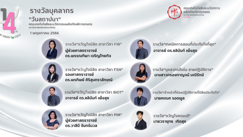 ข่าว 2023-05-02 รางวัลบุคลากร "วันสถาปนา" คณะเทคโนโลยีและนวัตกรรมผลิตภัณฑ์การเกษตร มหาวิทยาลัยศรีนครินทรวิโรฒ 1 พฤษภาคม 2566