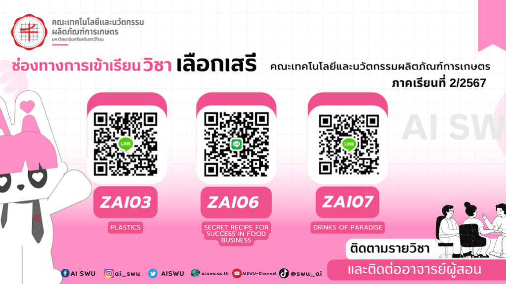 ช่องทางการติดต่อชุดวิชาเลือกเสรี ภาคเรียนที่ 2/2567 คณะเทคโนโลยีและนวัตกรรมผลิตภัณฑ์การเกษตร 📌📌📌📌📌📌📌📌
