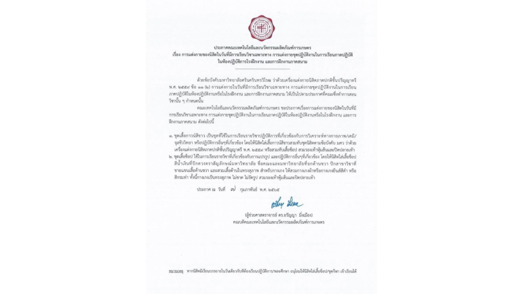 เรื่อง การแต่งกายของนิสิตในวันที่มีการเรียนวิชาเฉพาะทาง การแต่งการชุดปฎิบัติงานในการเรียนภาคปฏิบัติ ในห้องปฏิบัติการโรงฝึกงาน และการฝึกภาคสนาม